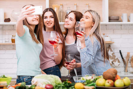 Cheers. Group of friends having home party. Weekend leisure. Urban lifestyle. Young women taking selfie.
