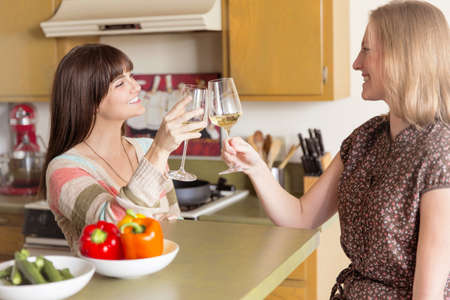 Mid adult female friends raising a glass in kitchen