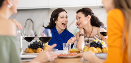 Happy women congregated around a festive table, participating in animated discussions and enjoying the delights of wine