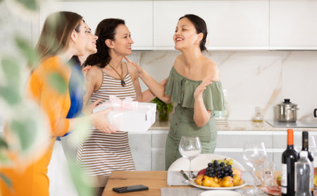 Three women have arrived for birthday celebration and presenting gift to birthday woman