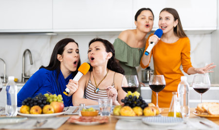 Group of female friends are having fun singing karaoke during feast and gatherings.