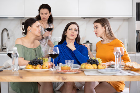 Group of mature women drinking red wine from wine glasses and talking to each other while standing in the kitchen at home party