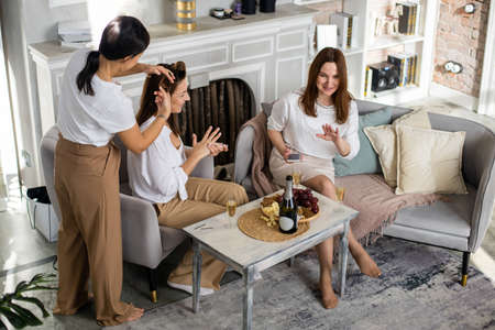 Nice charming attractive cheerful glad cheery positive ladies clinking wine chillout chill-out cool vacation in modern light white interior room indoors