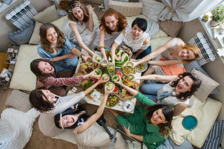 Top view group modern hippie female friends celebrating holiday at table serving with healthy food