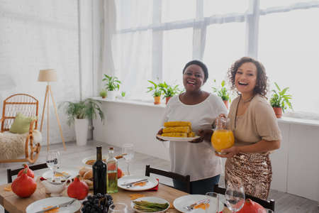 Happy african american women holding corn and orange juice near decorated thanksgiving dinner