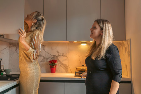 Three well-dressed ladies having a home party in the kitchen