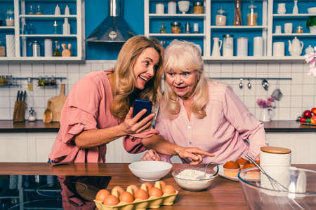 Beautiful senior woman and daughter baking in the kitchen - Grandmother preparing desserts at home with family and looking at recipe on the internet, concepts about cooking, healthy eating and technology
