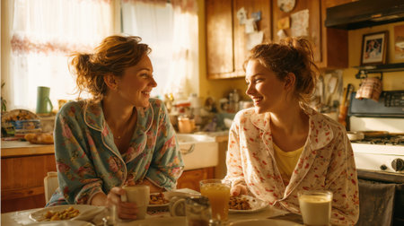 Two sisters sharing genuine laughter during cozy morning breakfast conversation in warm sunlit vintage kitchen wearing floral pajamas.