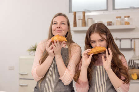 Cooking with mom, happy girl carrying tray and smelling freshly cooked croissants, kitchen interior, copy space