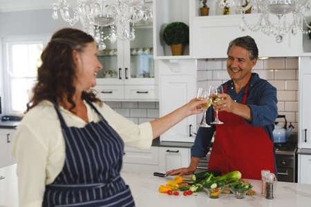 Happy senior caucasian couple in kitchen cooking together, drinking wine. retirement lifestyle, spending time at home.