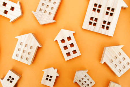 Many miniature wooden houses. Real estate concept. Buying and selling housing. Rent. Mortgage rates. Market Analytics. Demand for housing. Rising and falling home prices. Population