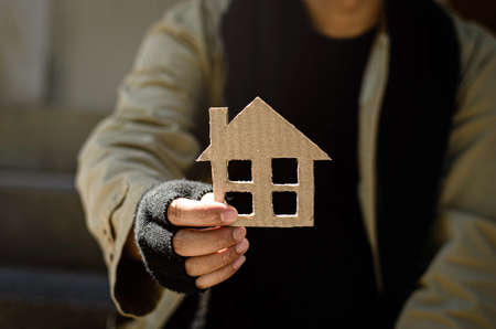 A homeless man who is discouraged, desperate, erring from life. homeless A homeless beggar handed a picture of a paper house for help with donations.