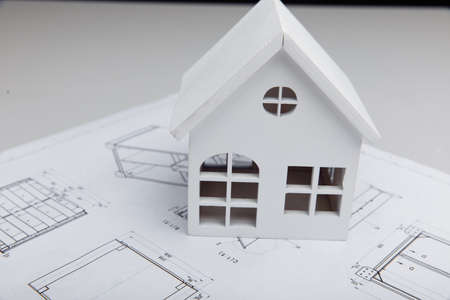 Close-up of a small house model, an architect engineer designs the house and its interior and draws a floor plan through a design program. Architect concept design house.