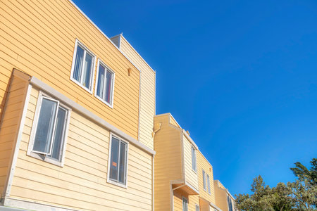 Low angle view of an apartment building with casement windows and wood lap siding in San Francisco. Apartment building exterior with yellow wood siding and glass casement windows against the sky.