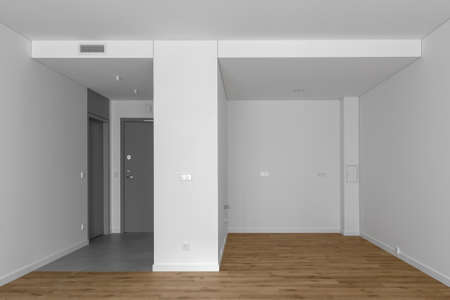 Empty minimalist modern room with white walls, opened grey door, grey floor tiles and oak wood floor