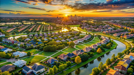 Aerial shot capturing the warm glow of sunset over the diverse suburban neighborhoods