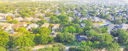 Panorama aerial view urban sprawl subdivision near Dallas, Texas, USA row of single family homes large fenced backyard