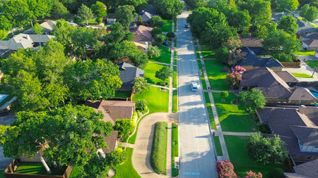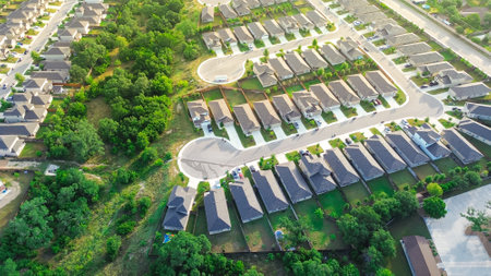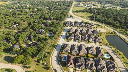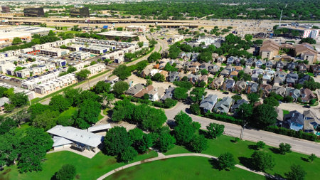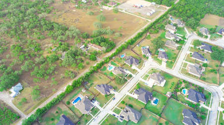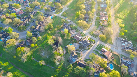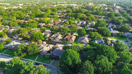 Bird eye view clean and peaceful neighborhood streets with row of single family homes near Dallas, Texas, USA