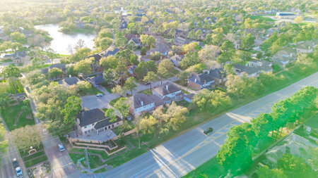 Sunset over lush green North Eldridge Parkway along upscale gated community in unincorporated area northwestern Harris County, Houston, Texas, row of expensive mansion homes with pools, aerial. USA