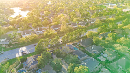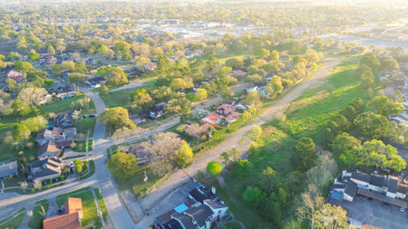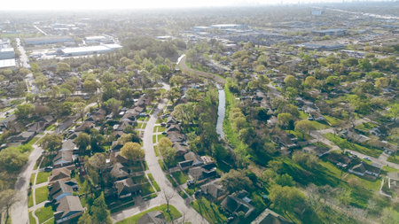 Suburban residential houses single family homes with swimming pool, well-trimmed landscape in Greater Inwood northwest part of Houston, Texas, grass lined drainage channel, early light, aerial. USA