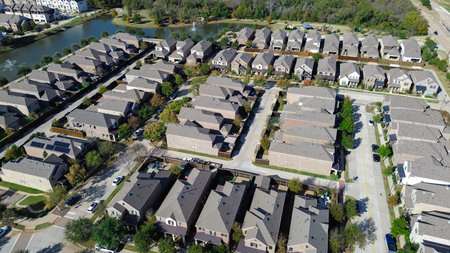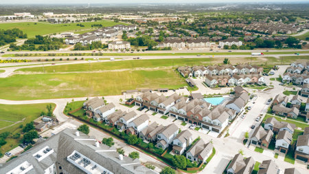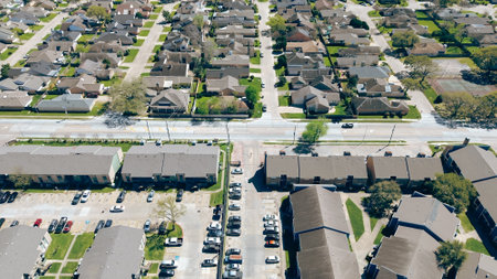 Multistory apartment complex buildings and suburban residential houses along Corporate Drive near Chinatown in Houston, Texas, row of modest single-family homes, well-trimmed landscape, aerial. USA