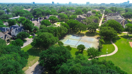 Tennis courts with players in lush green inner suburb urban park of upscale residential sustainable community luxury mansion houses in established Preston Hollow, Dallas downtown skylines, Texas. USA