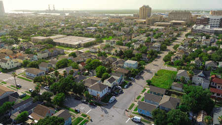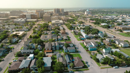 Galveston residential homes with parked cars, varied rooftop near medical district and Port of Galveston stretches toward the harbor. Cranes, industrial structures rise behind, maritime economy. USA