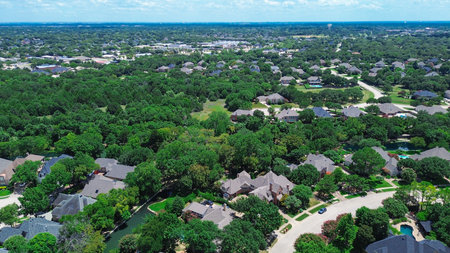 Farm to Market Road 407 fast growing residential area in Argyle and Bartonville, Denton County, Texas, new development two story suburban house solar roofing, lush green belt urban forest, aerial. USA