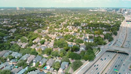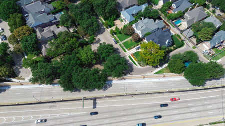 Row of skylines, office buildings busy US 75 highway with overpass signalized intersection and Highland Park residential neighborhood, corridor-edge planning and commuter infrastructure layering. USA