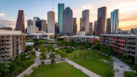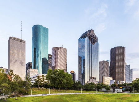 Houston downtown skyline during sunset. Buffalo Bayou Park. Texas, USA
