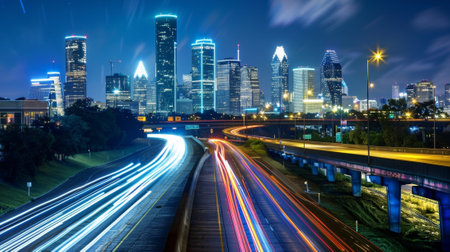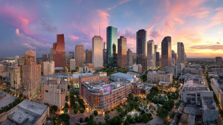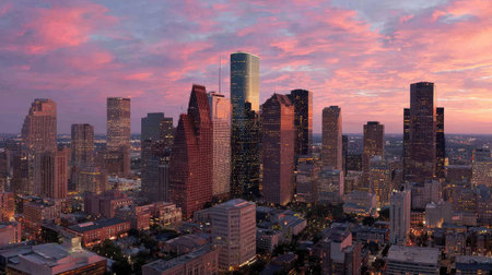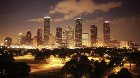 A scenic night view of the city of Houston with modern buildings and skyscrapers