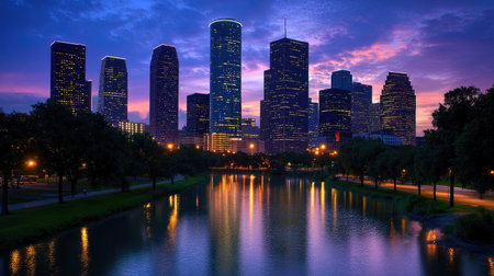 Stunning view of Houston's skyline at dusk, with vibrant lights reflecting on the calm water. A perfect blend of urban life and natural beauty.