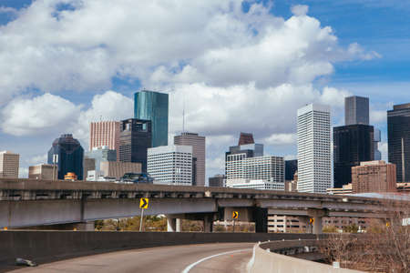 Interstate 45 and the downtown Houston skyline, in Houston, Texas