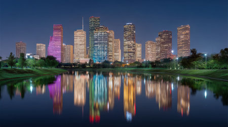 Experience the breathtaking Houston skyline illuminated at night. The vibrant colors reflect beautifully off the calm waters, showcasing urban beauty and serenity.