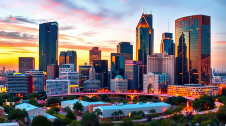 Vibrant cityscape of San Antonio at sunset showcasing modern architecture and lively skyline