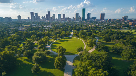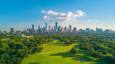 Aerial view of the vibrant green hermann park stretching out beneath the impressive houston skyline, with the clear blue sky and fluffy white clouds creating a picturesque backdrop