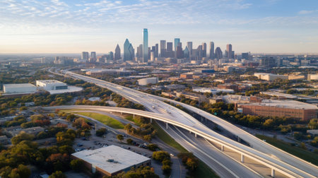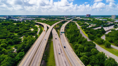 This stunning aerial image captures an urban highway intersection, surrounded by vibrant greenery and under a bright blue sky, emphasizing movement and connectivity.
