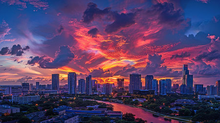 A view of the Austin, Texas skyline at sunset. The sky is a vibrant gradient of pink, orange, and blue, with fluffy clouds scattered across. A calm river in the foreground perfectly reflects the colorful sky and the modern skyscrapers of the city. Lush green trees and prominent palm trees frame the scene, adding a tropical feel to the urban landscape. The golden hour light bathes the buildings in a warm glow, creating a serene and picturesque atmosphere.