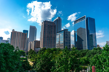 A mesmerizing view of modern buildings against a blue sky on a sunny day in Houston, Texas