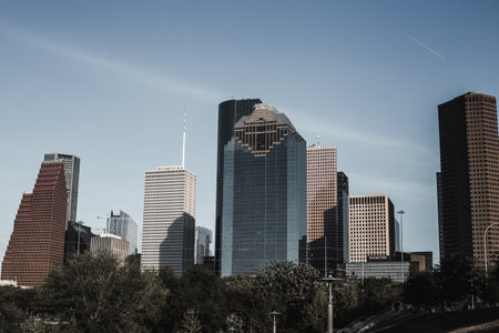 A mesmerizing view of modern buildings against a blue sky in Houston, Texas