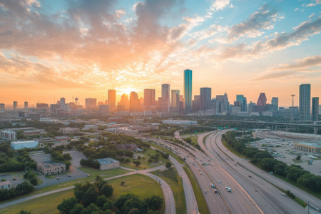 Houston's skyline shines at sunset, with warm clouds and busy highways filled with cars.
