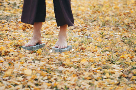 Alternative medicine and mindfulness practice - standing on sadhu board nails barefoot