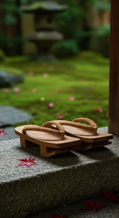 A pair of traditional geta wooden shoes on a stone step. Red maple leaves are scattered in a beautiful, serene japanese moss garden in the background.