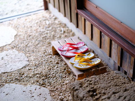 pair of japanese traditional shoe on stone floor with stone and wood step