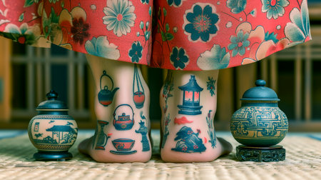 An AI generated illustration of ankles with tattoos depicting elements of an East Asian tea ceremony, alongside traditional porcelain ware.