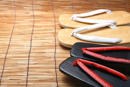 Japanese sandals for men and women on bamboo blinds. Concept of Japanese summer.