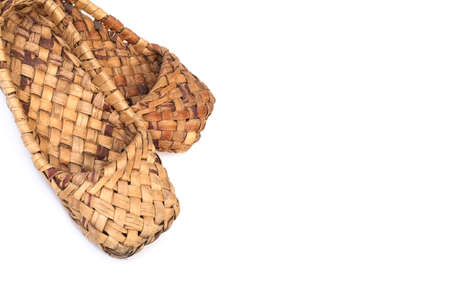 Ancient national shoes woven from bark of tree and hemp isolated on white background