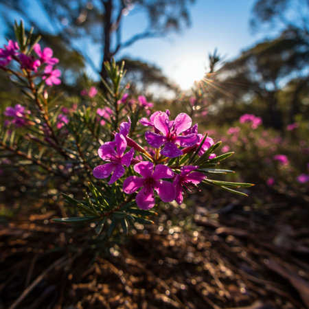 Pink flowers in the bush at sunset in the Australian bushland.
