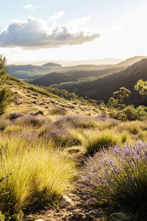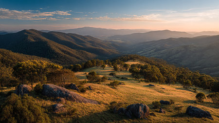 Golden Hour Over Rolling Hills and Distant Mountains Scenery