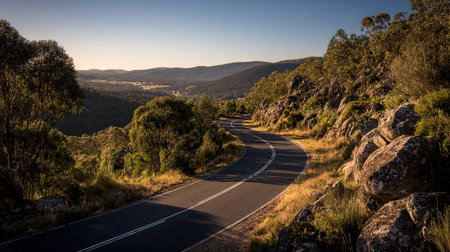 Curving mountain road winds through a vibrant, natural landscape environment.